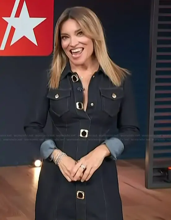 Kit Hoover on Access Hollywood on NBC was spotted wearing this denim button front dress on Access Hollywood on Sep 29 2025's episode. Kit's Dress is the Collared Mini Shirt Dress by Avec Les Filles.