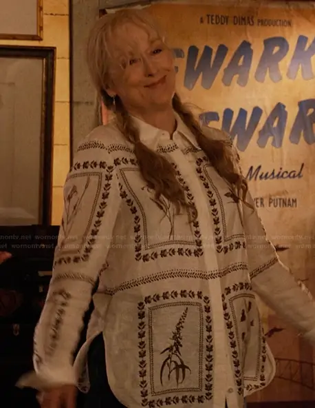 Loretta Durkin (played by Meryl Streep) on Only Murders in the Building on Hulu was spotted wearing this white floral print shirt on Only Murders in the Building on episode 'Flatbush' (5x06) in Sep 2025. Loretta's Top is the Simcoa Linen & Silk Longline Shirt by Ted Baker.