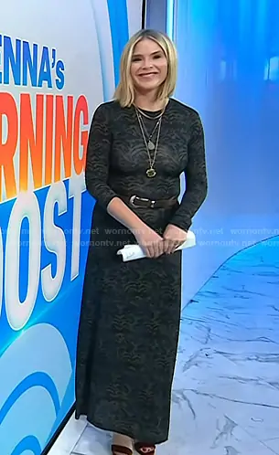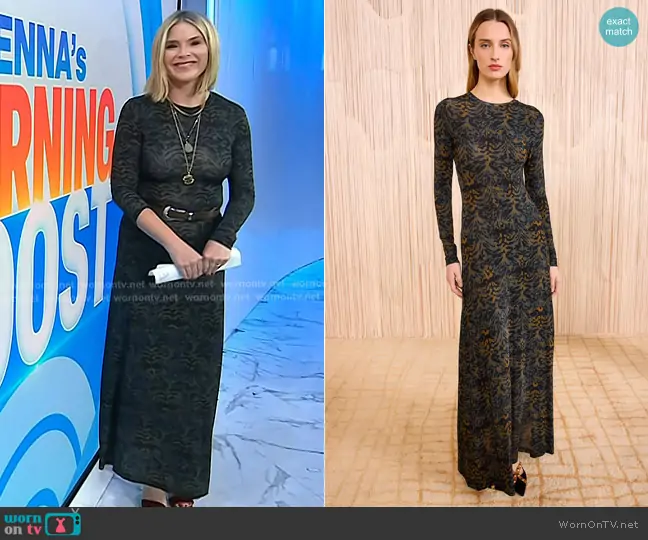 Jenna Bush Hager on Today on NBC was spotted wearing this black printed maxi dress on Today on Sep 30 2025's episode. Jenna's Dress is the Amari Jersey Long Sleeve Dress in Desert Jasper by Ulla Johnson.