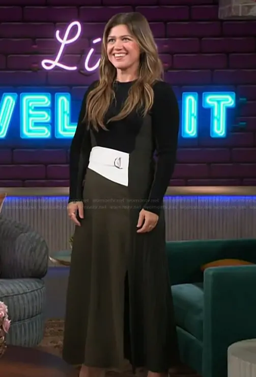Kelly Clarkson on The Kelly Clarkson Show on NBC was spotted wearing this colorblock belted dress on The Kelly Clarkson Show on Sep 30 2025's episode. Kelly's Dress is the Emilina Rib Knit Panmelled Belted Dress by Reiss.