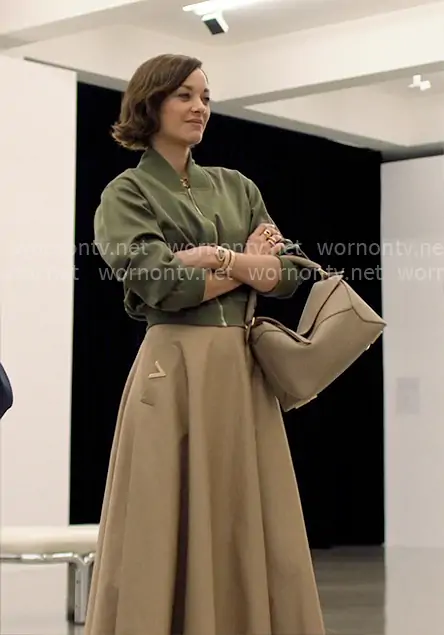 Celine Dumont (played by Marion Cotillard) on The Morning Show on Apple TV was spotted wearing this green bomber jacket and beige skirt on The Morning Show on episode 'Tipping Point' (4x03) in Sep 2025. Celine's Jacket is the Cala Shrunken Bomber Jacket by Sablyn . Celine's Skirt is the Stretch Cotton Midi Skirt by Valentino Garavani . Celine's Necklace is the Carlyle™ Necklace by David Yurman . Celine's Watch is the Serpenti Spiga Watch by Bvlgari . Celine's Bag is the Medium Puzzle Bag in Taupe by Loewe.