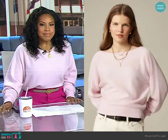 Sheinelle Jones on Today on NBC was spotted wearing this pink sweater and wide-leg pants on Today on Oct 01 2025's episode. Sheinelle's Sweater is the Cashmere Boatneck Sweater in Porcelain Pink by J. Crew . Sheinelle's Pants is the Wide Leg Pants in Hot Pink by Aqua . Sheinelle's Belt is the Reversible Logo-Plaque Belt by Gucci.