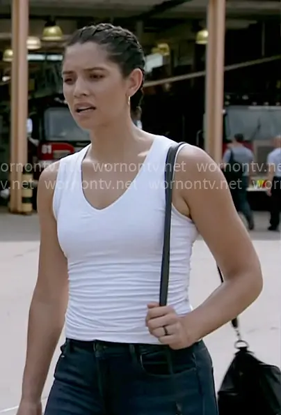 Stella Kidd (played by Miranda Rae Mayo) on Chicago Fire on NBC was spotted wearing this white v-neck tank top on Chicago Fire on episode 'Kicking Down Doors' (14x01) in Oct 2025. Stella's Top is the Pima Cotton Ruched V-Neck Tank by ATM Anthony Thomas Melillo.