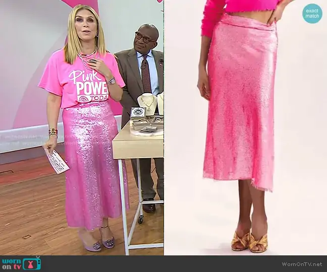 Jill Martin on Today on NBC was spotted wearing this pink sequin skirt and pearl earrings on Today on Oct 01 2025's episode. Jill's Skirt is the Cadena Midi Skirt by LoveShackFancy . Jill's Jacket is the Chenille Logo Sherpa Lounger Jacket by Jill Martin . Jill's Earrings is the Pearl Hoop Earrings in Gold by Jennifer Miller . Jill's Necklace is the Pink Manifestation Locket Necklace by Awe Inspired . Jill's Shoes is the Hangisi 105 Satin Pump in violet by Manolo Blahnik.