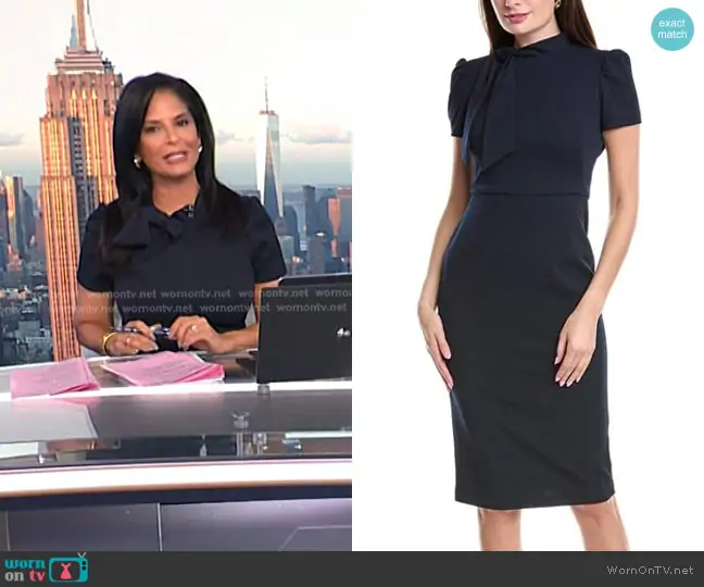 Darlene Rodriguez on Today on NBC was spotted wearing this navy tie neck dress on Today on Oct 02 2025's episode. Darlene's Dress is the Solid Crepe Classic Novelty Short Sleeve Sheath Dress by Maggy London.