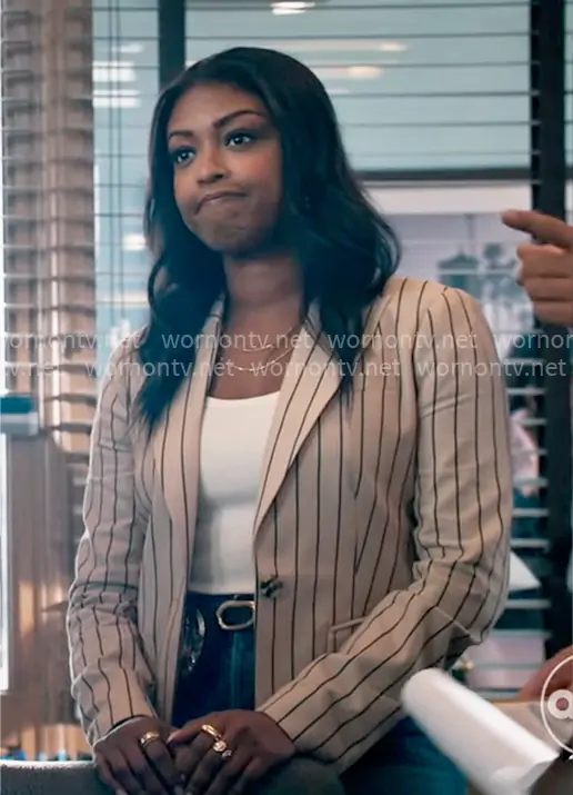 Daphne (played by Javicia Leslie) on High Potential on Hulu was spotted wearing this beige striped blazer on High Potential on episode 'Behind the Music' (2x04) in Oct 2025. Daphne's Jacket is the The Miranda Blazer by Favorite Daughter.
