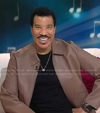 on Today on NBC was spotted wearing this Lionel Richie’s leather zip jacket on Today on Oct 03 2025's episode. 's Jacket is the Long Sleeved Lambskin Shirt in Brown by Paul Smith.