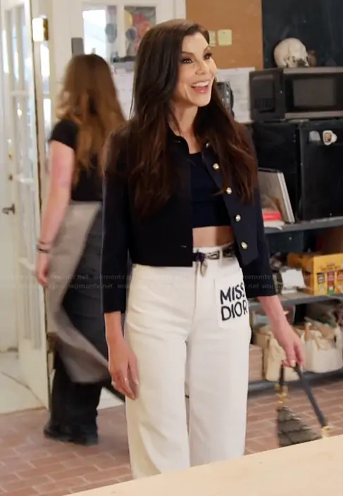 Heather Dubrow on The Real Housewives of Orange County on Bravo was spotted wearing this black cropped jacket and pants on The Real Housewives of Orange County on episode 'Not So Funfetti' (19x13) in Oct 2025. Heather's Jacket is the Kumi Cropped Jacket by L'Agence . Heather's Pants is the Flared Pants by Dior . Heather's Bag is the Oblique Saddle Bag Blue by Christian Dior.