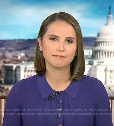 Elizabeth Schulze on Good Morning America on ABC was spotted wearing this purple ribbed polo top on Good Morning America on Oct 03 2025's episode. Elizabeth's Top is the Fara Ribbed Knitted Shirt in Purple by Hobbs.
