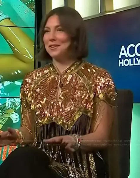 on Access Hollywood on NBC was spotted wearing this embellished fringe top on Access Hollywood on Oct 03 2025's episode. 's Top is the Star Tassel Beaded Cape by Nasty Gal.