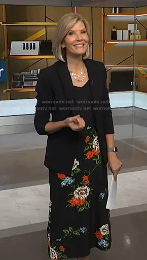 Kate Snow on NBC News Daily on NBC was spotted wearing this black floral dress and blazer on NBC News Daily on Oct 03 2025's episode. Kate's Dress is the Quinn Floral-Print Crepe Slip Dress by Tibi . Kate's Jacket is the Scuba Jacket by Veronica Beard.