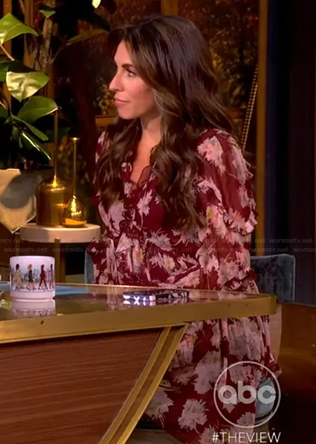 Alyssa Farah Griffin on The View on ABC was spotted wearing this red floral mini dress with ruffles on The View on Oct 06 2025's episode. Alyssa's Dress is the Mae Bouquet Albani Ruffle-Trim Minidress by Cinq a Sept.