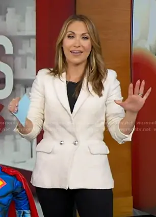 Lori Bergamotto on Good Morning America on ABC was spotted wearing this white textured double breasted blazer on Good Morning America on Oct 06 2025's episode. Lori's Jacket is the Vileno Blazer by Maje.