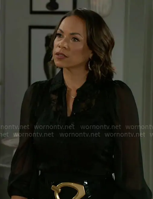 Nicole Dupree Richardson (played by Daphnee Duplaix) on Beyond the Gates on CBS was spotted wearing this black embroidered blouse and ruffle hem skirt on Beyond the Gates on Oct 06 2025's episode. Nicole's Top is the Roanne Blouson Sleeve Top by Alice + Olivia . Nicole's Skirt is the Kelso Ruffled Plisse Maxi Skirt by Simkhai . Nicole's Belt is the Cut-Out Leather & Brass Belt by Tom Ford.