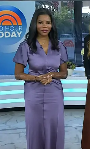 on Today on NBC was spotted wearing this purple gathered dress on Today on Oct 07 2025's episode. 's Dress is the Gathered V-Neck Midi Dress in Iris by Victoria Beckham.