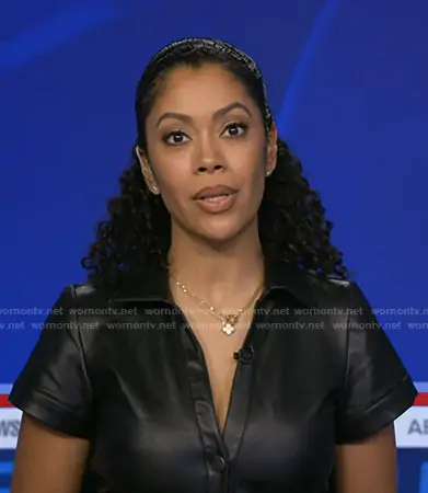 Shirleen Allicot on Good Morning America on ABC was spotted wearing this black leather dress on Good Morning America on Dec 10 2025's episode. Shirleen's Dress is the Faux-Leather Short-Sleeve Ruched Midi Shirt Dress by Pilcro.