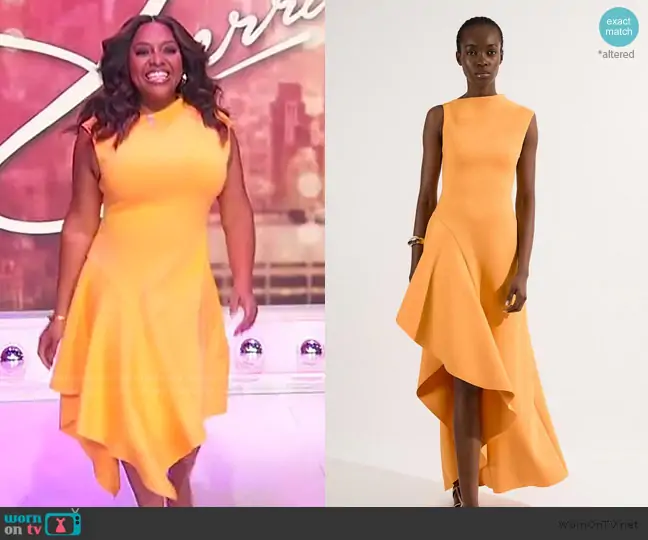 Sherri Shepherd on Sherri on FOX was spotted wearing this yellow asymmetric dress on Sherri on Oct 07 2025's episode. Sherri's Dress is the Scuba Drama Ruffle Hem Woven Maxi Dress by Karen Millen.