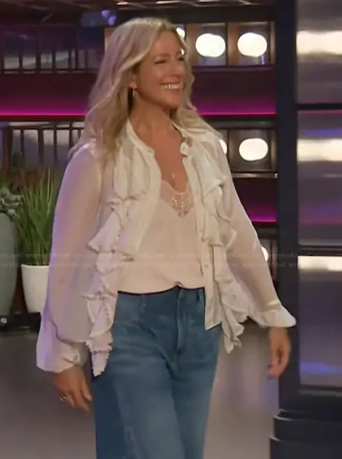 on The Kelly Clarkson Show on NBC was spotted wearing this white ruffle blouse on The Kelly Clarkson Show on Oct 07 2025's episode. 's Shoes is the Taani Wedge Sandals by Guess.