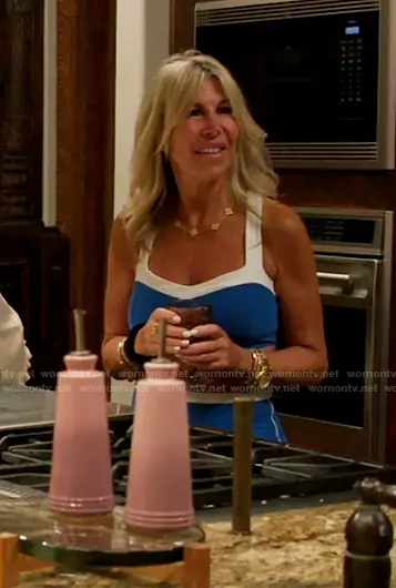 Amy Kaplan on The Golden Bachelor on ABC was spotted wearing this blue sports bra top and leggings on The Golden Bachelor on episode 'Week 3' (2x03) in Oct 2025. 's Top is the Space Dye Colorblock Sports Bra in Court Blue Heather/Cloud by Beyond Yoga . 's Leggings is the Trophy Spacedye High Waist Leggings in Court Blue Heather/Cloud by Beyond Yoga.