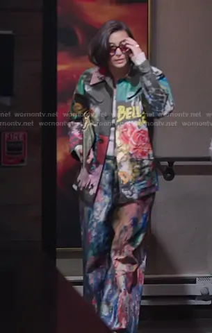 Bronwyn Newport on The Real Housewives of Salt Lake City on Bravo was spotted wearing this graffiti jacket and pants on The Real Housewives of Salt Lake City on episode 'Petty Little Liars' (6x04) in Oct 2025. Bronwyn's Jacket is the Graffiti Art Print Jacket in Green by Dolce & Gabbana . Bronwyn's Pants is the 1981 Baggy Jeans by Acne Studios . Bronwyn's Sunglasses is the 48mm Special Edition Heart Sunglasses by Gucci . Bronwyn's Bag is the Dollar Bill Clutch Bag by Moschino . Bronwyn's Shoes is the The Flash Chelsea Boots by Bottega Veneta.