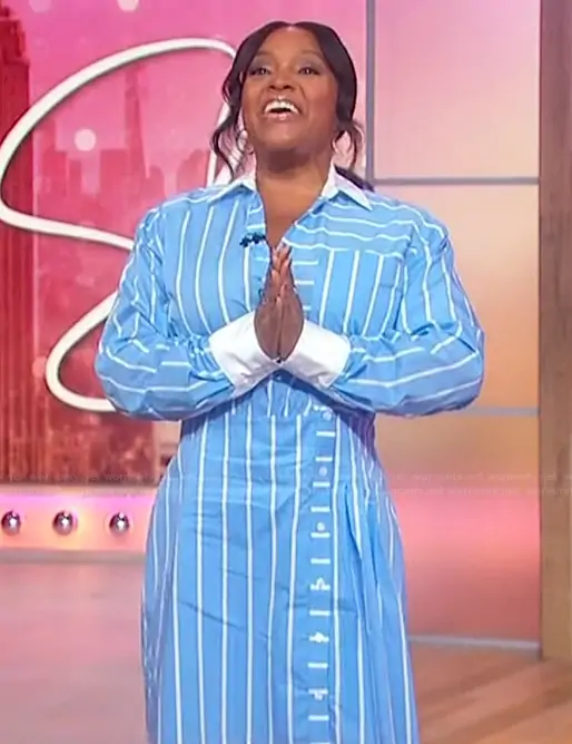 Sherri Shepherd on Sherri on FOX was spotted wearing this blue striped shirtdress on Sherri on Oct 08 2025's episode. Sherri's Dress is the Poppe Striped Shirtdress by Veronica Beard . Sherri's Shoes is the Web Accent Leather Slingback Pumps by Gucci.