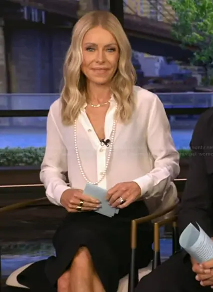 Kelly Ripa on Live with Kelly and Mark on Disney ABC Home Entertainment was spotted wearing this white blouse on Live with Kelly and Mark on Oct 08 2025's episode. Kelly's Top is the The Simone Button-Up Blouse by Numi.