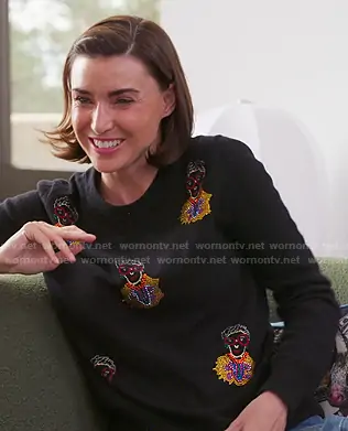 Bronwyn Newport on The Real Housewives of Salt Lake City on Bravo was spotted wearing this black embellished sweater and heart cutout jeans on The Real Housewives of Salt Lake City on episode 'Petty Little Liars' (6x04) in Oct 2025. Bronwyn's Sweater is the Cashmere Printed Sweater by Libertine . Bronwyn's Pants is the Cay Embellished Jeans by Alice + Olivia.