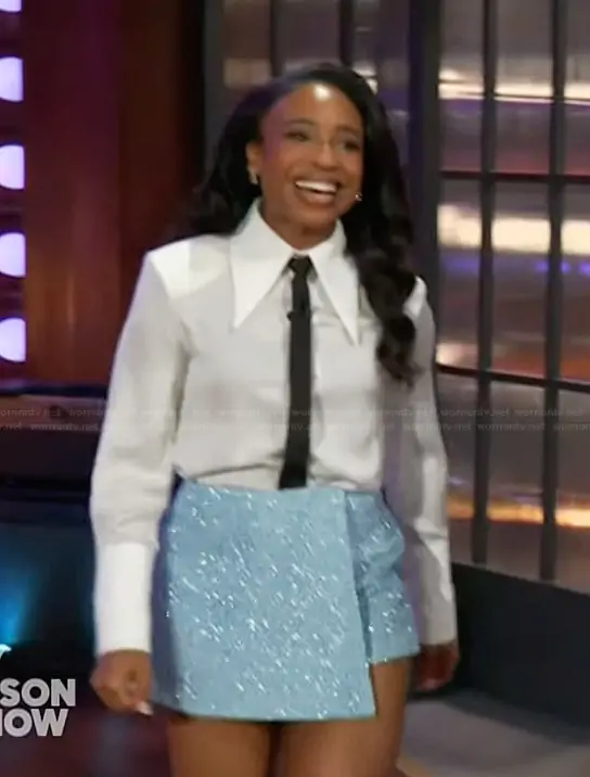 on The Kelly Clarkson Show on NBC was spotted wearing this metallic blue skirt and top on The Kelly Clarkson Show on Oct 08 2025's episode. 's Top is the Blair Top by Bronx and Banco . 's Tie is the Tie by Bronx and Banco . 's Skirt is the Blair Skort by Bronx and Banco.