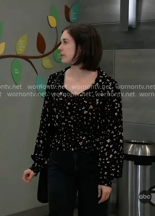 Willow Tait (played by Katelyn MacMullen) on General Hospital on ABC was spotted wearing this black floral top on General Hospital on Oct 08 2025's episode. Willow's Top is the Print Peplum Blouse by Sanctuary .