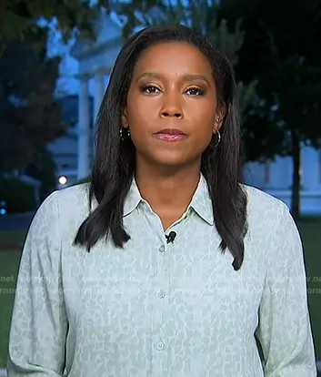 Rachel Scott on Good Morning America on ABC was spotted wearing this green print button down shirt on Good Morning America on Oct 08 2025's episode. Rachel's Top is the Geo Print Crepe Button-up Shirt in mint creme by Halogen.