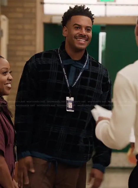 Tariq (played by Zack Fox) on Abbott Elementary on ABC was spotted wearing this blue plaid sweater on Abbott Elementary on episode 'Cheating' (5x02) in Oct 2025. 's Sweater is the Polite Logo-Embroidered Checked Organic Cotton-Corduroy Sweatshirt by Story MFG..