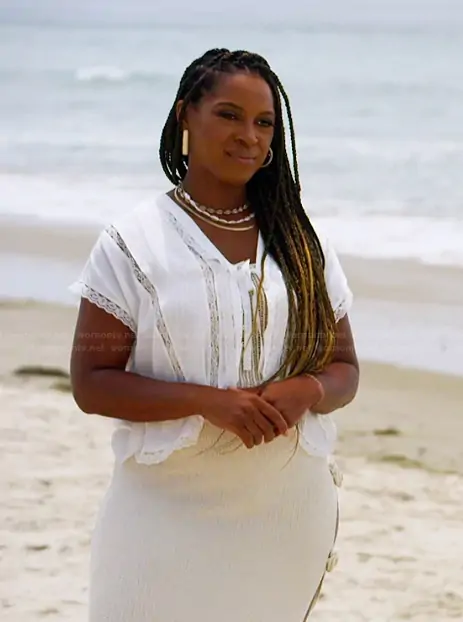 Free People Marigold Shine Lace Top worn by Janine Rubenstein on The Golden Bachelor