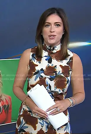 Chloe Melas on Today on NBC was spotted wearing this brown floral print dress on Today on Oct 09 2025's episode. Chloe's Dress is the The Martina Mockneck Dress in Floral Haze by M.M.LaFleur.