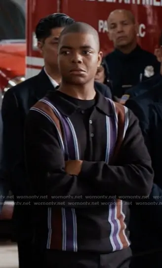 Harry Grant (played by Elijah M. Cooper) on 9-1-1 on Fox was spotted wearing this black striped cardigan on 9-1-1 on episode 'Eat the Rich' (9x01) in Oct 2025. Harry's Sweater is the Longsleeve Arlo Polo by Carhartt WIP.