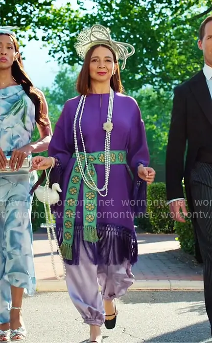 Molly Novak (played by Maya Rudolph) on Loot on Apple was spotted wearing this purple fringed dress with green belt on Loot on episode 'Lady Molly' (3x03) in Oct 2025. Molly's Dress is the Cady Couture midi dress by Valentino Garavani . Molly's Pants is the Silk trousers by Valentino Garavani . Molly's Belt is the Antibes scarf by Valentino Garavani . Molly's Bag is the Duck clutch bag by Simone Rocha . Molly's Shoes is the Ballerina 20 embellished leather flats by Valentino Garavani.