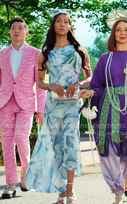 Sofia Salinas (played by Michaela Jaé Rodriguez) on Loot on Apple was spotted wearing this blue abstract print dress on Loot on episode 'Lady Molly' (3x03) in Oct 2025. Sofia's Dress is the Asymmetric Printed Satin Draped Midi-Dress by Victoria Beckham . Sofia's Shoes is the Luciana Wedge Sandal by Badgley Mischka.