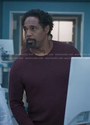 Dr. Ben Warren (played by Jason George) on Greys Anatomy on ABC was spotted wearing this burgundy textured sweater on Greys Anatomy on episode 'Only the Strong Survive' (22x01) in Oct 2025. 's Sweater is the Riley Textured Crewneck Sweater in Plum by John Varvatos.