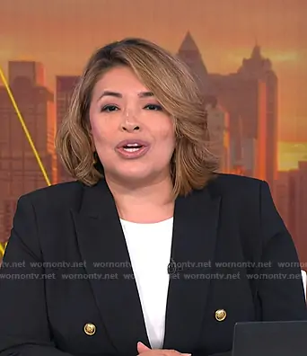on Today on NBC was spotted wearing this Gilma Avalos’s black blazer on Today on Oct 10 2025's episode. 's Jacket is the Walter Double-Breasted Jacket in Black by Derek Lam 10 Crosby.