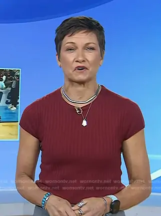 Stephanie Gosk on Today on NBC was spotted wearing this red ribbed tee on Today on Oct 10 2025's episode. Stephanie's Top is the New Ribbed Featherweight Cashmere T-shirt in Bordeaux Berry by J. Crew.