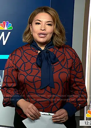 on NBC News Daily on NBC was spotted wearing this red printed tie neck blouse on NBC News Daily on Oct 10 2025's episode. 's Top is the Lucille Rope Print Silk Tie Neck Blouse in Orange by LK Bennett.
