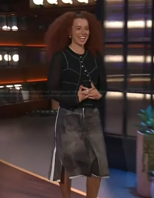on The Kelly Clarkson Show on NBC was spotted wearing this contrast stitch cardigan and skirt on The Kelly Clarkson Show on Oct 10 2025's episode. 's Sweater is the ribbed button-up cardigan by Tory Burch . 's Skirt is the Overprinted Deconstructed Denim Skirt by Tory Burch.
