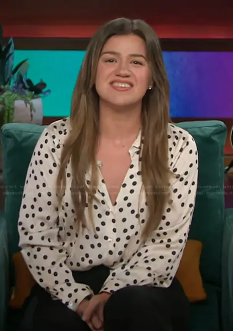 Kelly Clarkson on The Kelly Clarkson Show on NBC was spotted wearing this white polka dot print blouse on The Kelly Clarkson Show on Oct 10 2025's episode. Kelly's Top is the Argo Blouse by L'Agence.