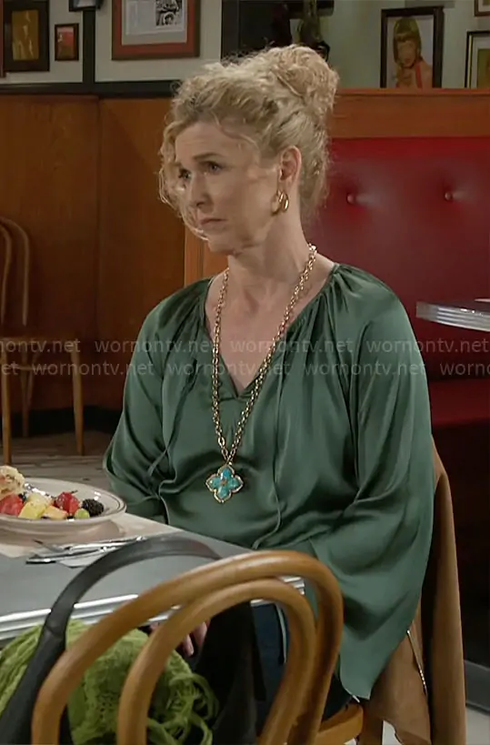 Jan Morgan (played by Jerri Tubbs) on Beyond the Gates on CBS was spotted wearing this green satin blouse on Beyond the Gates on Oct 10 2025's episode. Jan's Top is the Woven V-Neck Long Wide Sleeve Blouse in Dark Forest by 1.State . Jan's Necklace is the Maltese Cross Golden Chain Pendant Necklace in Turquoise by Barse.