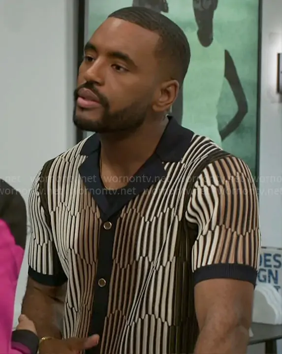 Andre Richardson (played by Sean Freeman) on Beyond the Gates on CBS was spotted wearing this brown geometric print shirt on Beyond the Gates on Oct 10 2025's episode. Andre's Shirt is the Andre Stripe Camp Shirt by Reiss x Che.