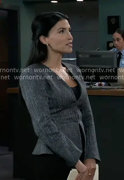Justine Turner (played by Nazneen Contractor) on General Hospital on ABC was spotted wearing this grey peplum jacket and tote bag on General Hospital on Dec 10 2025's episode. 's Jacket is the Peplum Jacket by Ann Taylor . 's Bag is the Cindy Tote by Calvin Klein.