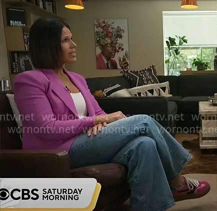 Dana Jacobson on CBS Mornings on CBS was spotted wearing this pink blazer and sneakers on CBS Mornings on Oct 12 2025's episode. Dana's Jacket is the Brooke Blazer in Bright Purple Jungle by L'Agence . Dana's Shoes is the Dodge Platform Sneaker in Pink by Steve Madden.