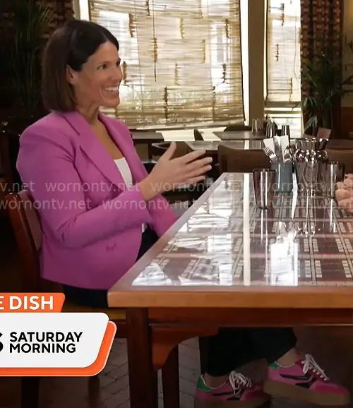 Dana Jacobson on CBS Mornings on CBS was spotted wearing this pink blazer and sneakers on CBS Mornings on Nov 16 2025's episode. Dana's Jacket is the Brooke Blazer in Bright Purple Jungle by L'Agence . Dana's Shoes is the Dodge Platform Sneaker in Pink by Steve Madden.