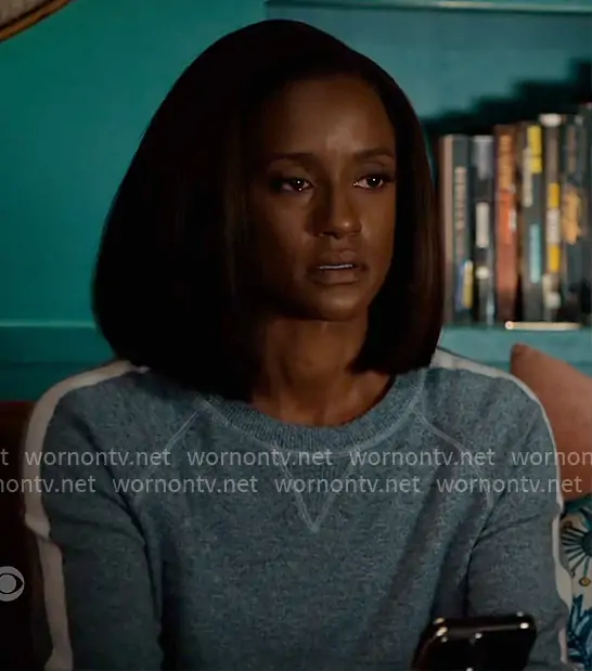 Olympia (played by Skye P. Marshall) on Matlock on CBS was spotted wearing this grey striped sleeve sewater on Matlock on episode 'The Before Times' (2x01) in Oct 2025. Olympia's Sweater is the Athletic Stripe Pullover Sweater by Theory.