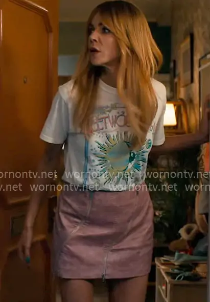 Morgan Gillory (played by Kaitlin Olson) on High Potential on Hulu was spotted wearing this Fleetwood Mac t-shirt and pink mini skirt on High Potential on episode 'Content Warning' (2x05) in Oct 2025. Morgan's Top is the Fleetwood Mac Dreams Boyfriend Tee by Daydreamer . Morgan's Skirt is the Domenica Skirt by BY.DYLN x Revolve . Morgan's Earrings is the Faux Pearl and Seashell Earrings by Zara . Morgan's Bag is the Moyen Messenger in Bleu Marine Woven Checker by Clare V.
