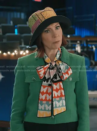 Elsbeth Tascioni (played by Carrie Preston) on Elsbeth on CBS was spotted wearing this butterfly print tie neck top on Elsbeth on episode 'Yes, And...' (3x01) in Oct 2025. Elsbeth's Top is the Jeannie Butterfly Print Silk Top in Flutters by Alice + Olivia.